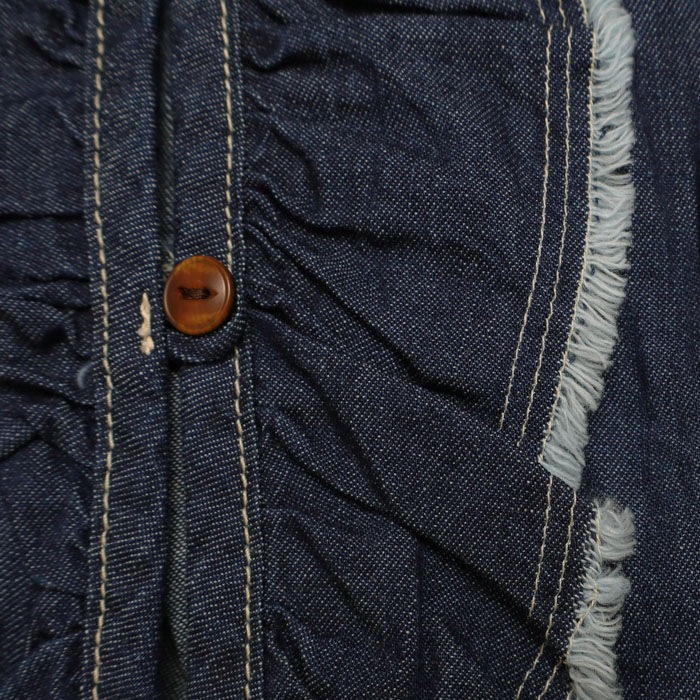 ゆったりとした身幅とボリュームのある袖のデザインが、リラックス感のあるシルエットを描き出します。大胆にあしらったフリルは、生地端を裁ち切ったカットオフデザインで、白いフリンジがアクセント。ヴィンテージライクな甘さとカジュアル感を加えています。前開きで羽織りとしても活躍し、ロングシーズン着回せる頼れるアイテムです。