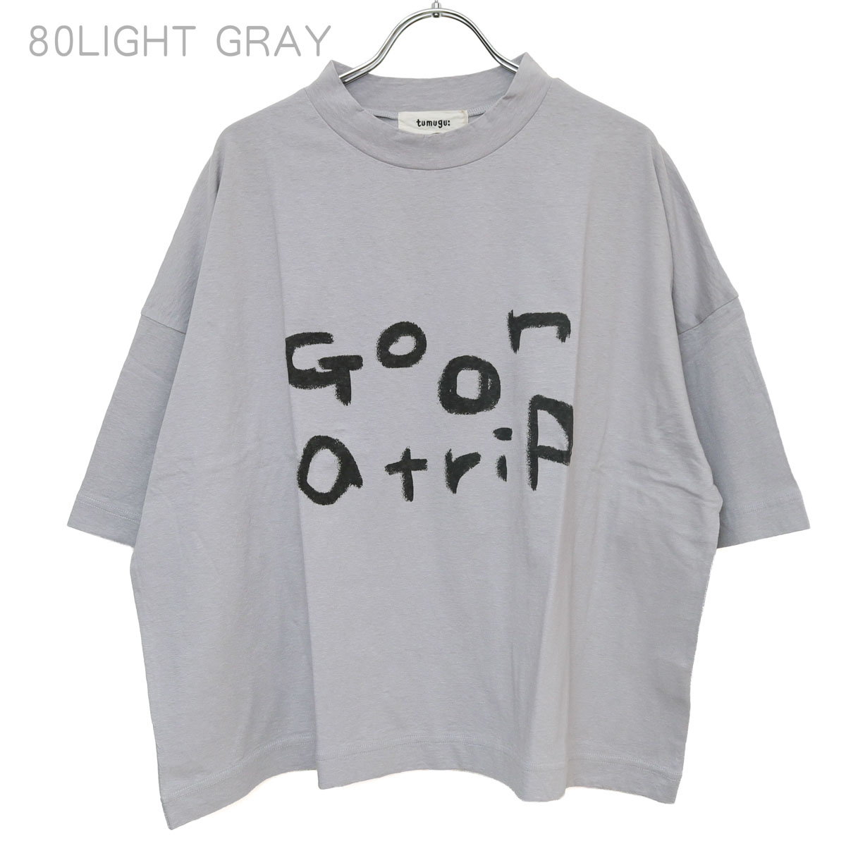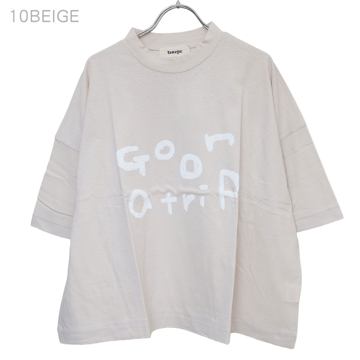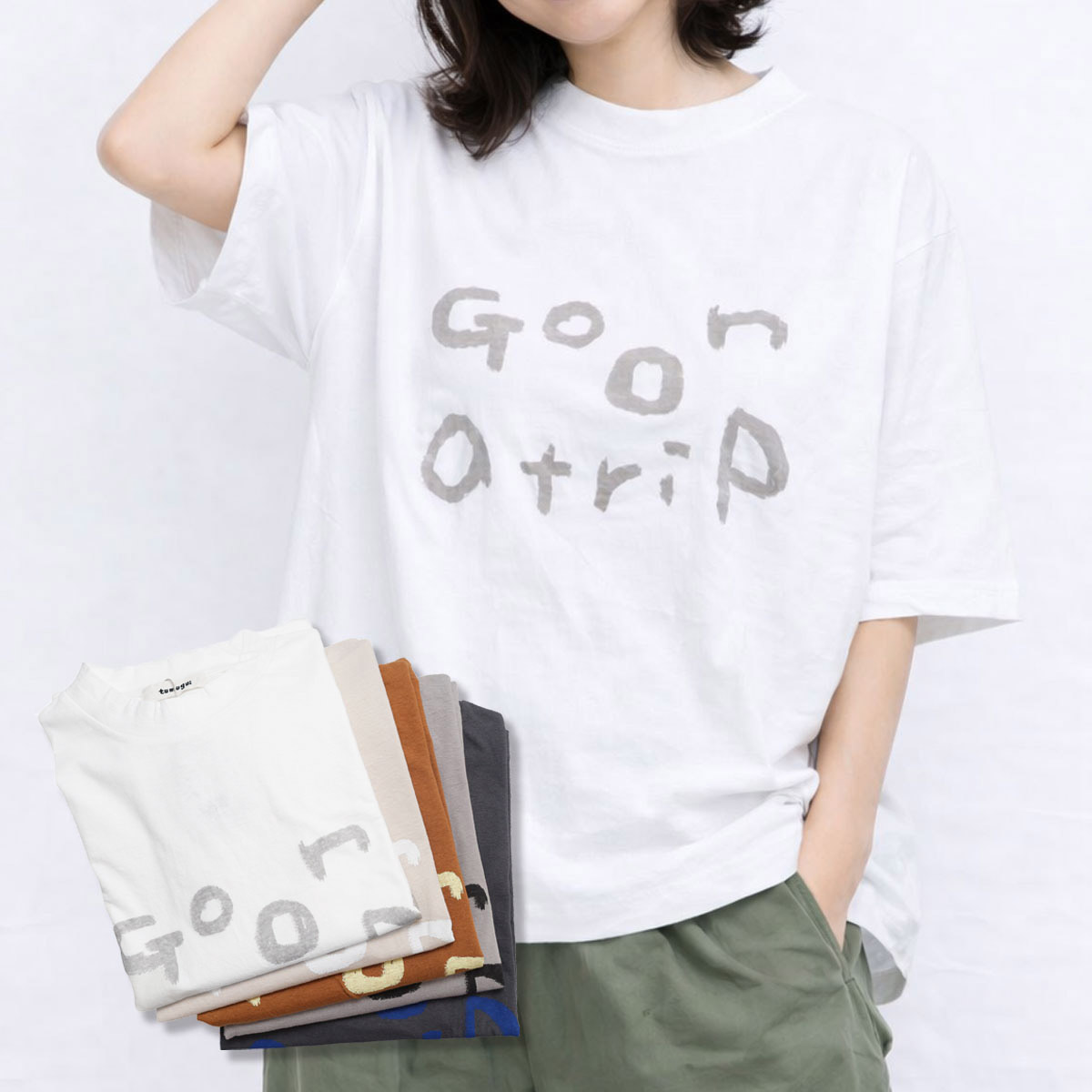 TC26103 ラフィ天竺 プリントT(go on a trip) は、tumugu:【ツムグ】のシンプルながらも、手書き風の「go on a trip」のロゴが目を引くプリントTシャツ。ラフィ糸特有のムラ感と、綿100%の柔らかな肌触りが魅力。ヴィンテージのような自然な風合いで、素肌に心地よく馴染みます。襟が少し立ち上がるボトルネック風のデザインが顔周りをスッキリと見せてくれます。身巾をたっぷりとった、ゆったりフォルム。二の腕をしっかりカバーしてくれる5分袖。ピタッとしないラフなシルエットが魅力です。