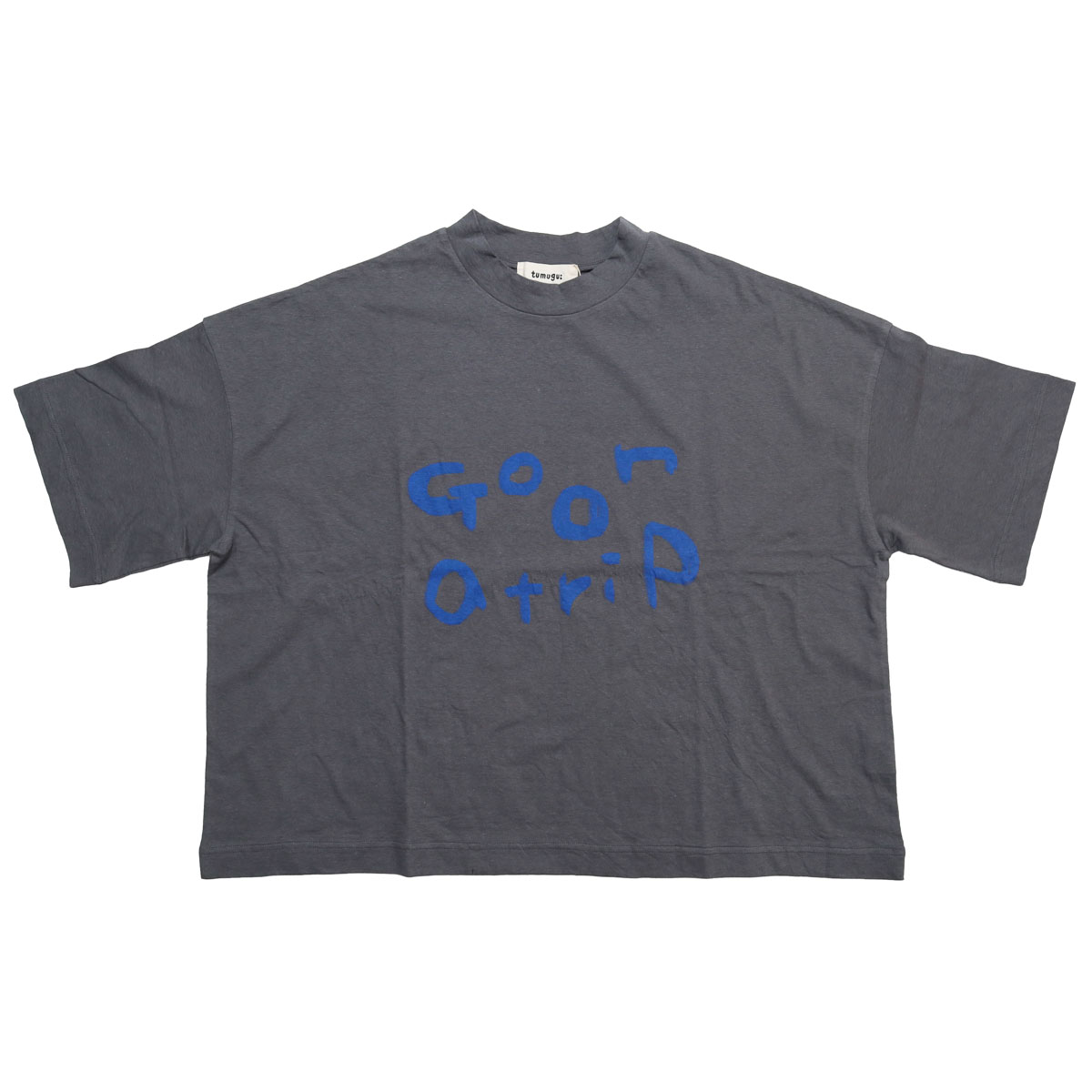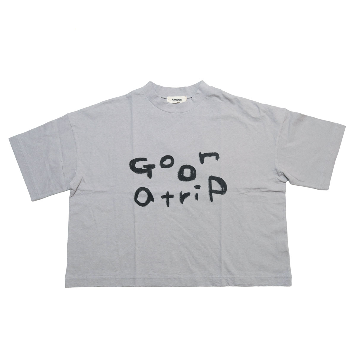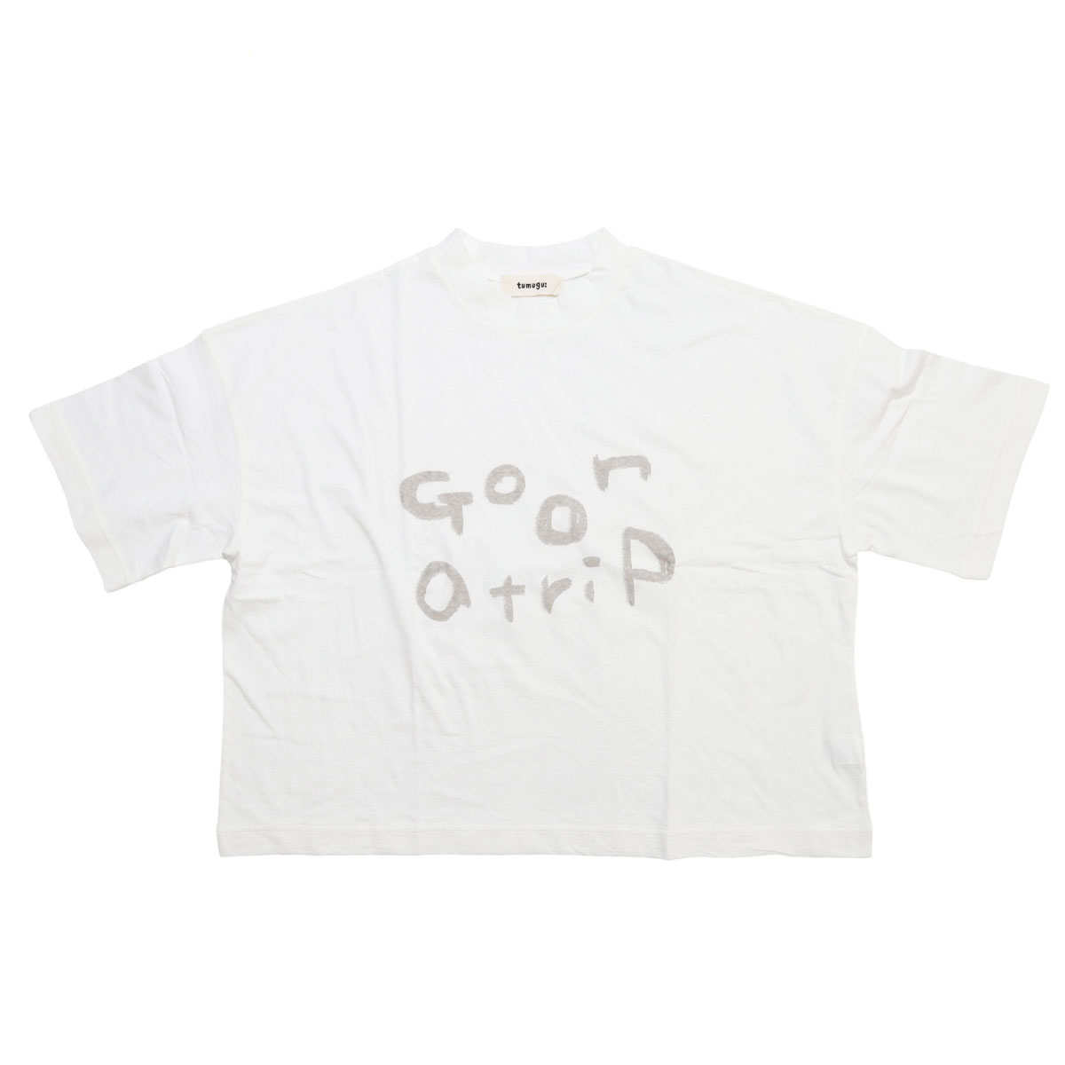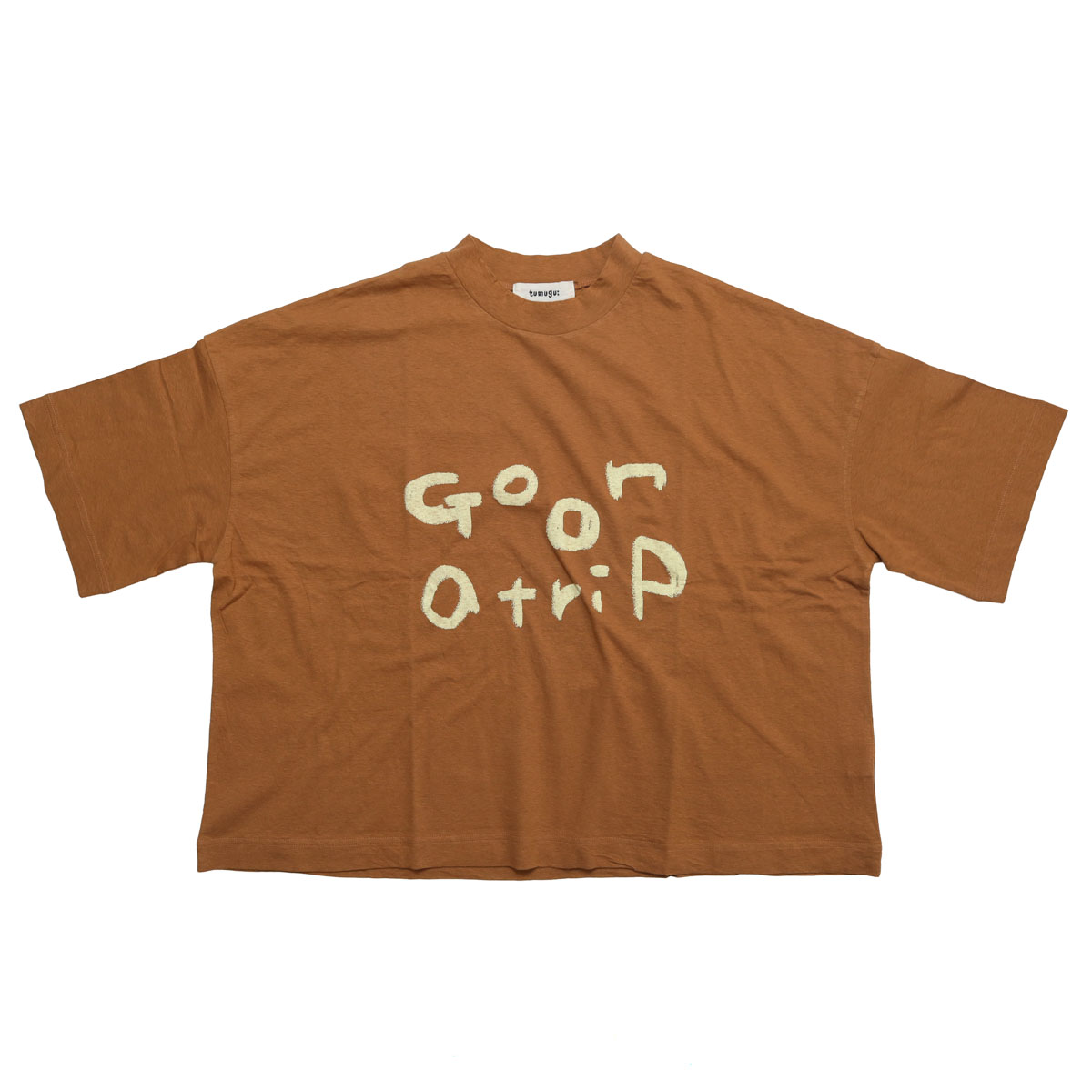 TC26103 ラフィ天竺 プリントT(go on a trip) は、tumugu:【ツムグ】のシンプルながらも、手書き風の「go on a trip」のロゴが目を引くプリントTシャツ。ラフィ糸特有のムラ感と、綿100%の柔らかな肌触りが魅力。ヴィンテージのような自然な風合いで、素肌に心地よく馴染みます。襟が少し立ち上がるボトルネック風のデザインが顔周りをスッキリと見せてくれます。身巾をたっぷりとった、ゆったりフォルム。二の腕をしっかりカバーしてくれる5分袖。ピタッとしないラフなシルエットが魅力です。