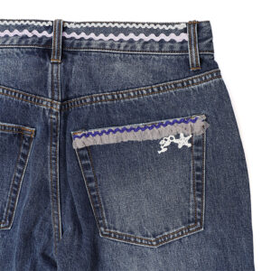 17EM999184 school of fish DENIM は、marble SUD【マーブルシュッド】の手仕事のぬくもり感が人気の”rhythm”リメイクデニム。人気テキスタイル”school of fish”からイメージして、カラフルなリボンの魚たちがデニムの海の中で泳いでいるデザインに。海の生き物のオリジナルレースや刺繍もふんだんに使った賑やかな一着です。
