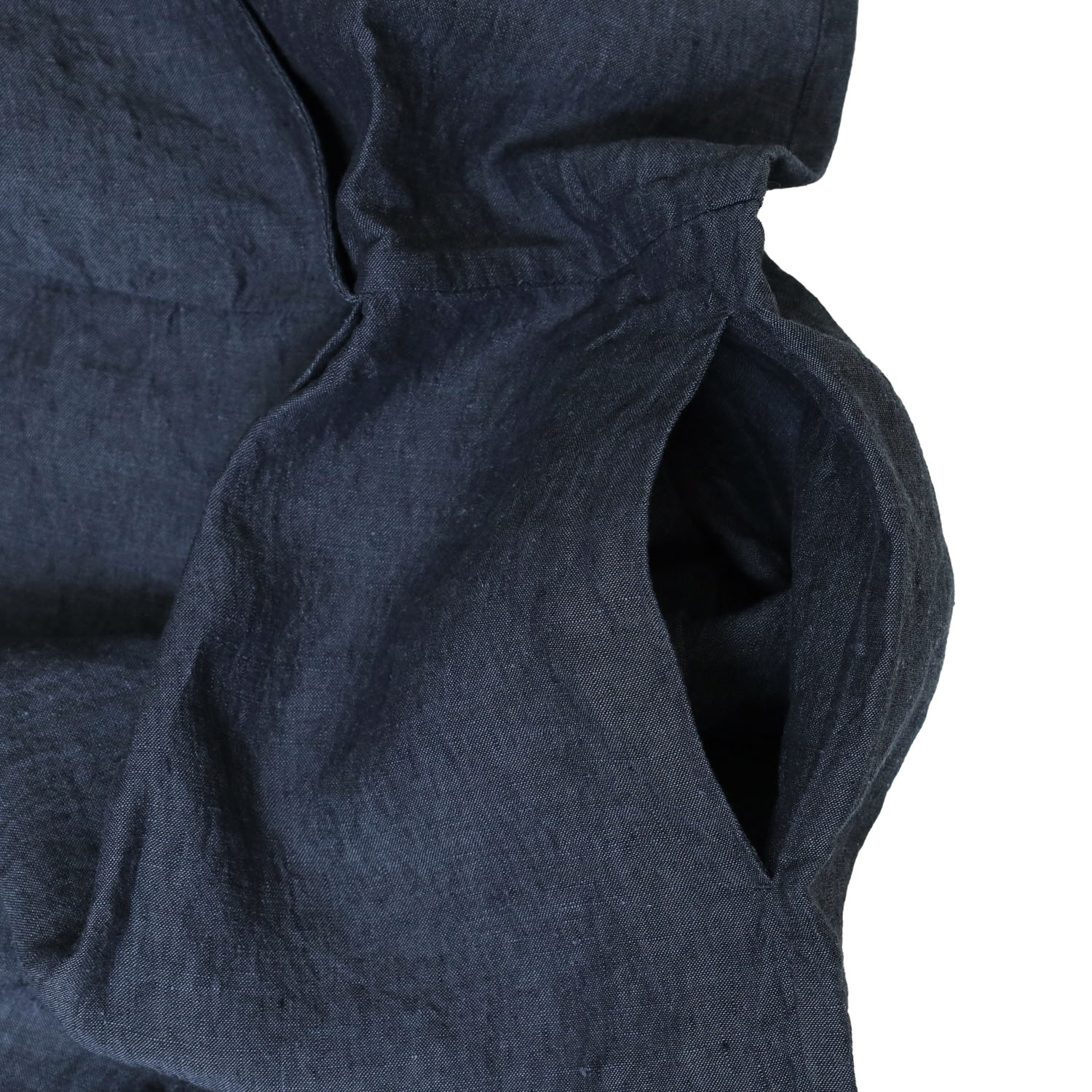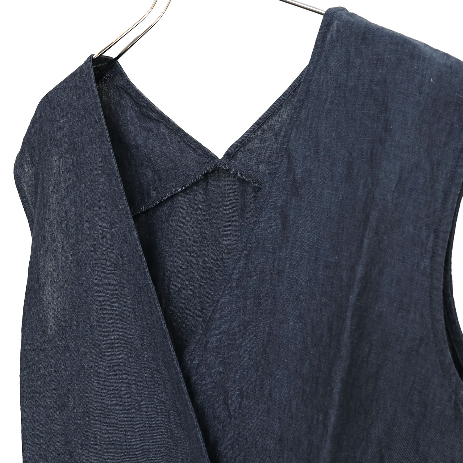 このワンピースの魅力は、青みの糸で織り上げた奥行きのある表情。シンプルなデザインながら、素材感そのものが引き立ち、着るだけで雰囲気のある装いに仕上がります。前合わせのデザインも印象的で、すっきりとしながらもさりげない個性を感じられるのがポイントです。着丈は 118cm とほどよく長さがあり、さらりと一枚で着るだけでも大人っぽい印象に。肩幅やバストにも程よいゆとりがあり、暑い季節にも軽やかに取り入れやすいバランスに仕上がっています