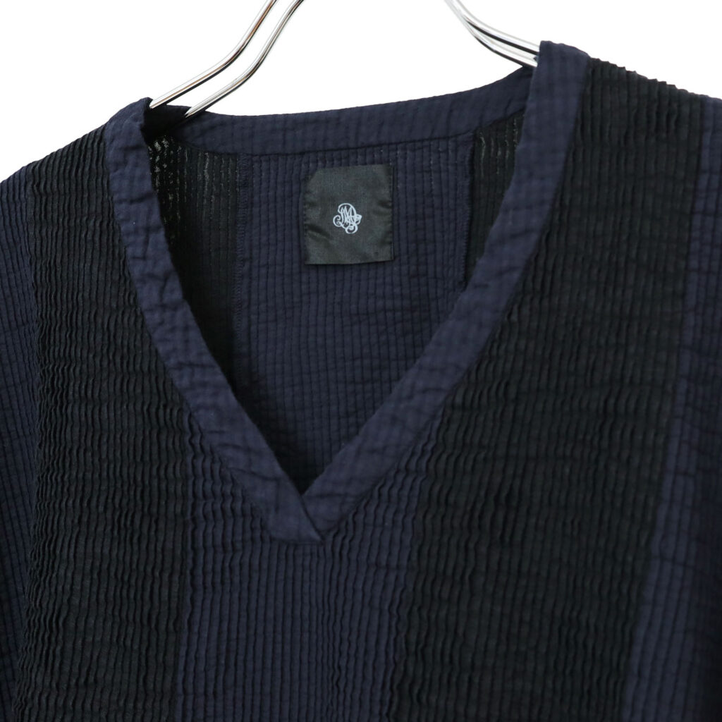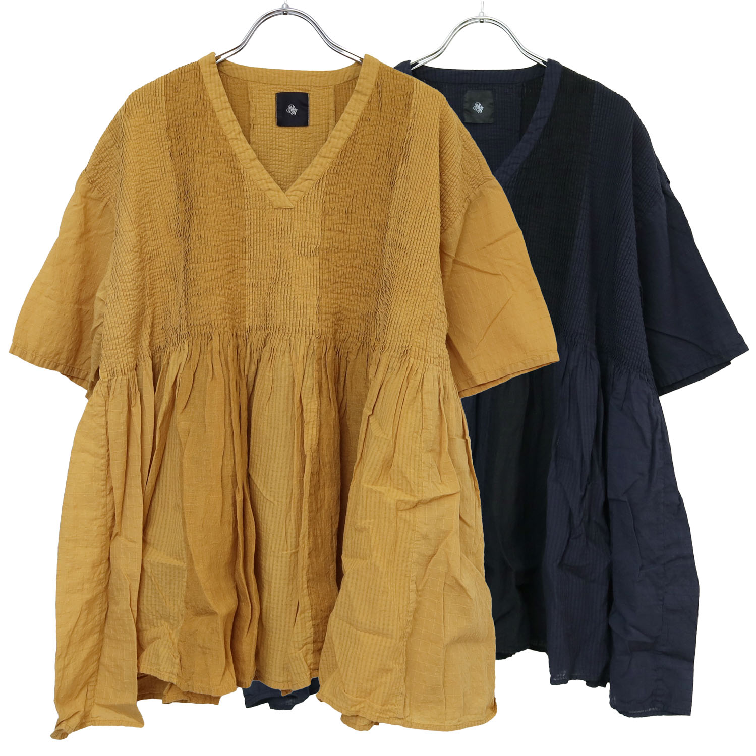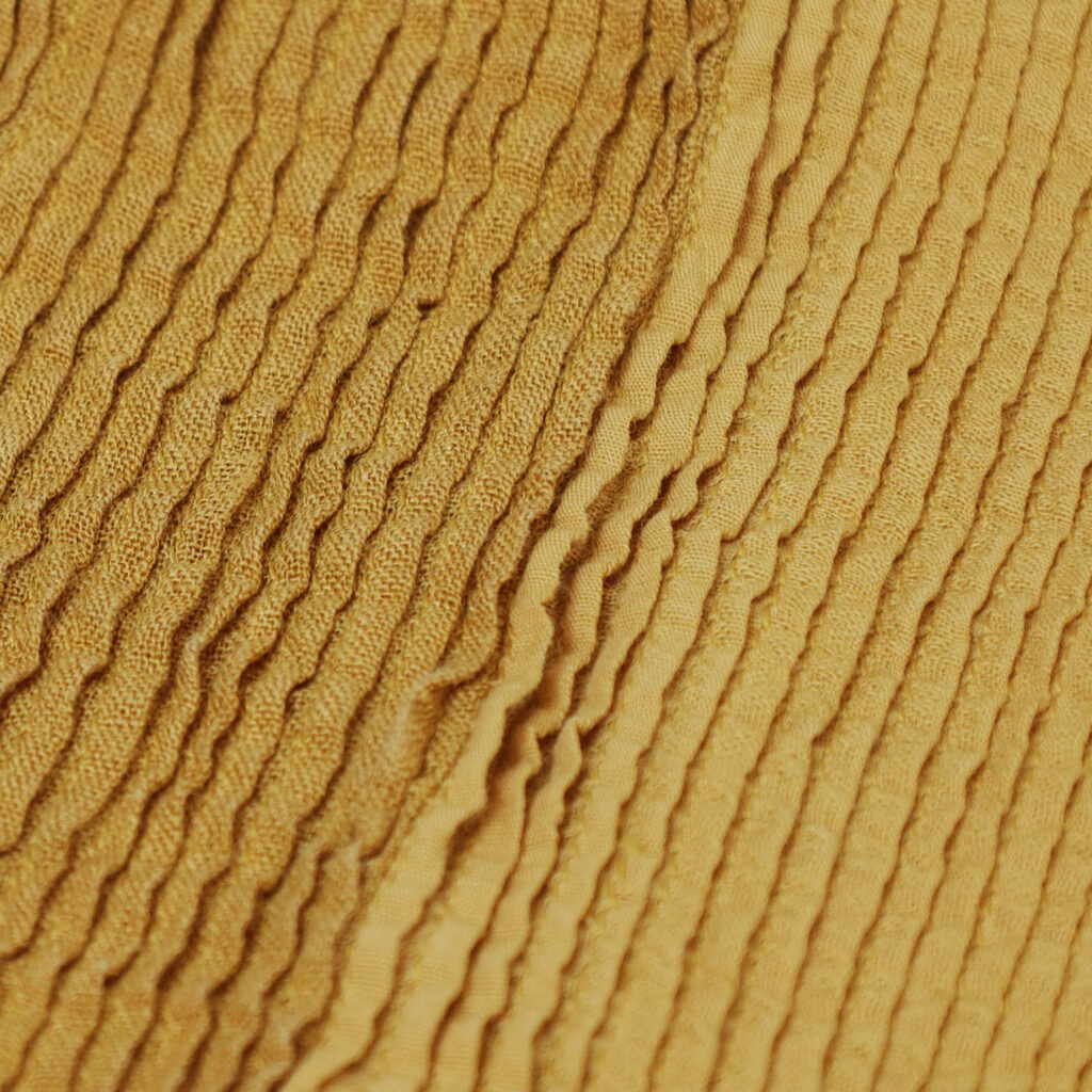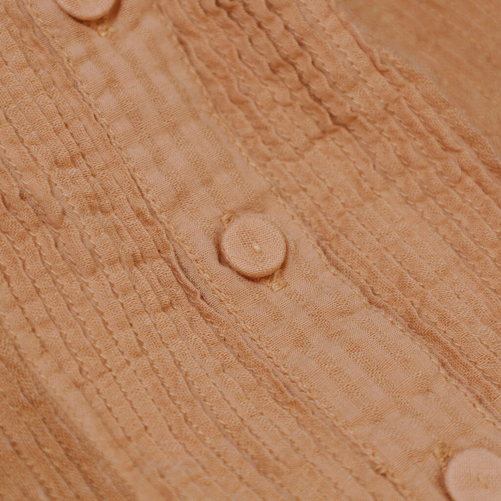 製品染めを施すことで、ドビー生地とリネン生地それぞれの染め上がりの違いが際立ち、素材の表情をより豊かに感じられる仕上がりになっています。