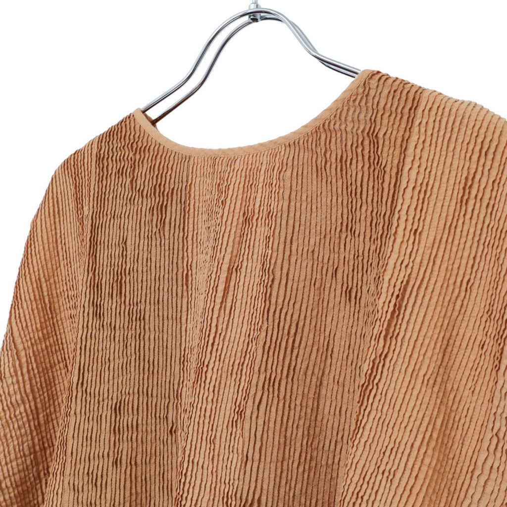異なる素材を組み合わせることで、それぞれの風合いが引き立ち、やわらかく奥行きのある雰囲気に。軽やかさの中に表情があり、シンプルに着るだけでも印象的な着こなしを楽しめます。