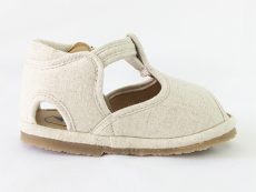 ZOOM【ズーム】のかわいいT-Strap Sandal。Tストラップでホールド感があり安定して歩ける定番ベビーサンダル。麻素材でサラリと清涼感があり、合わせやすい生成がかわいい一足。ギフトにも大変喜ばれます◎